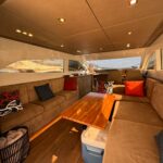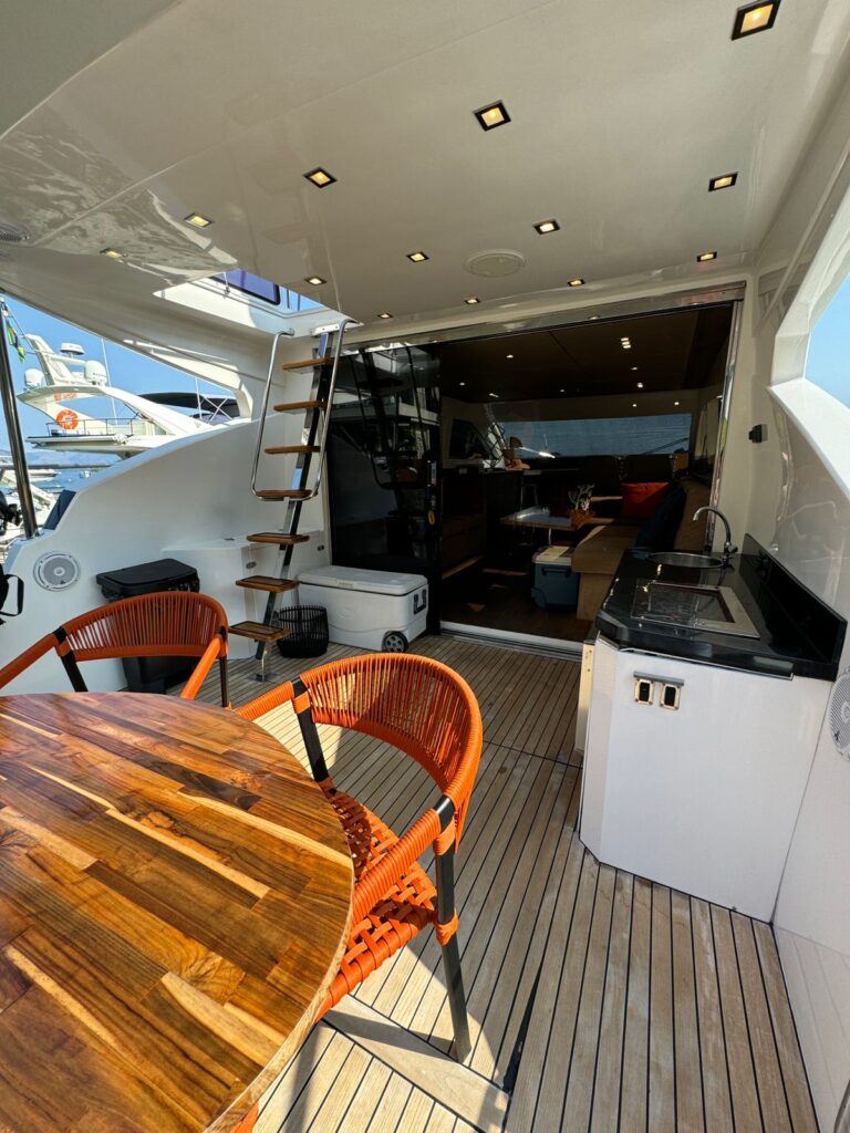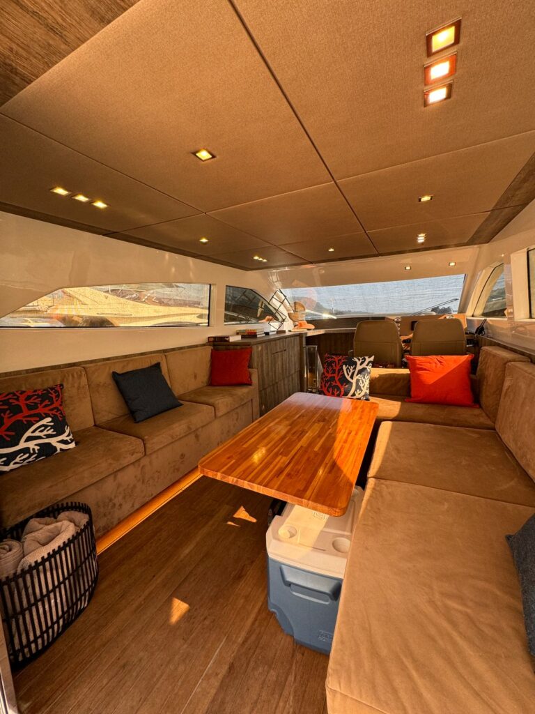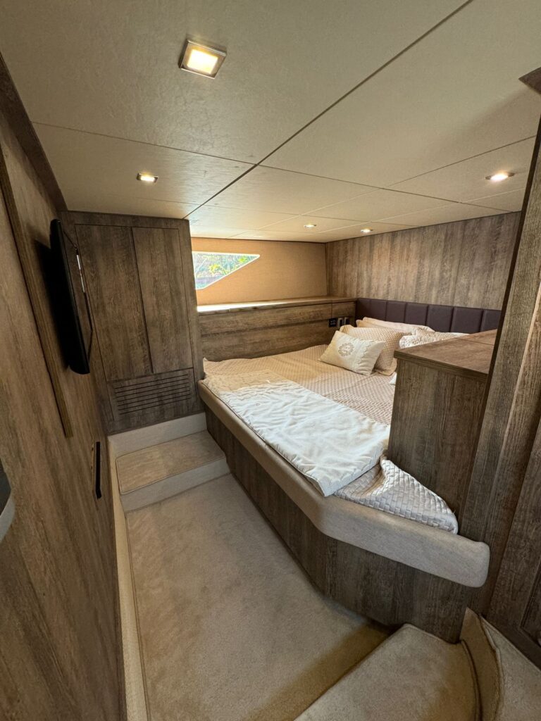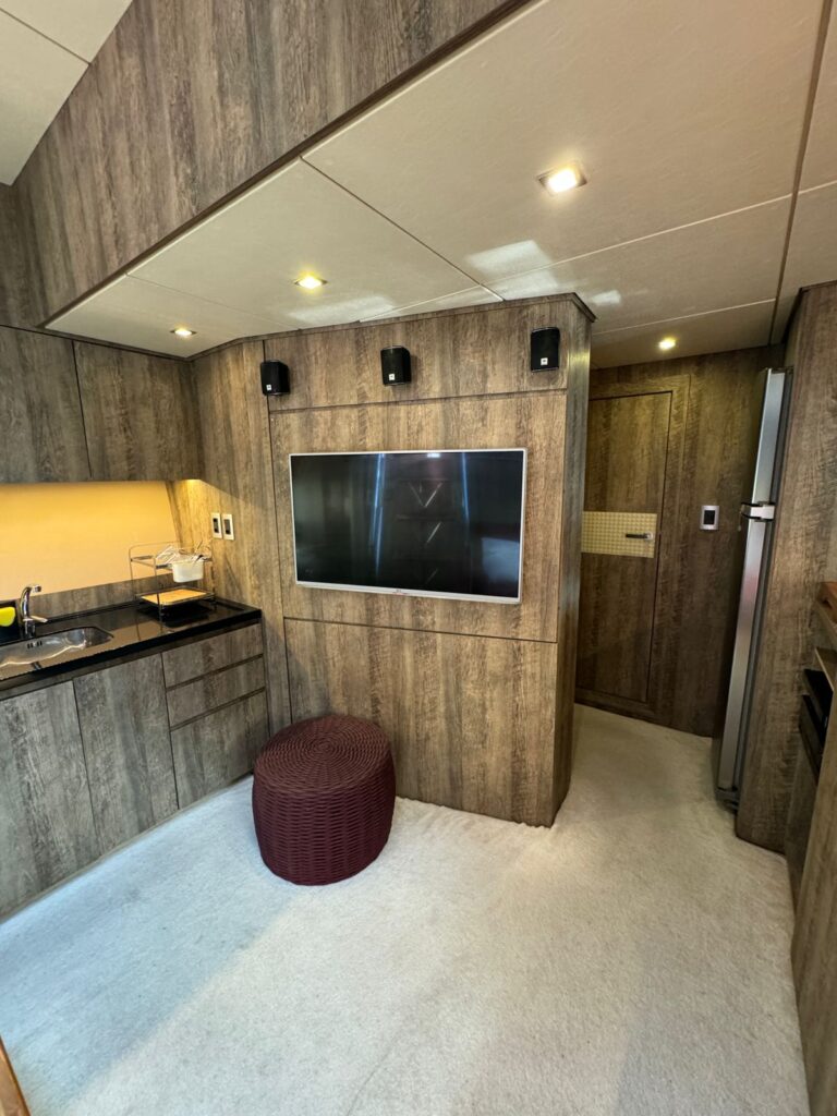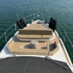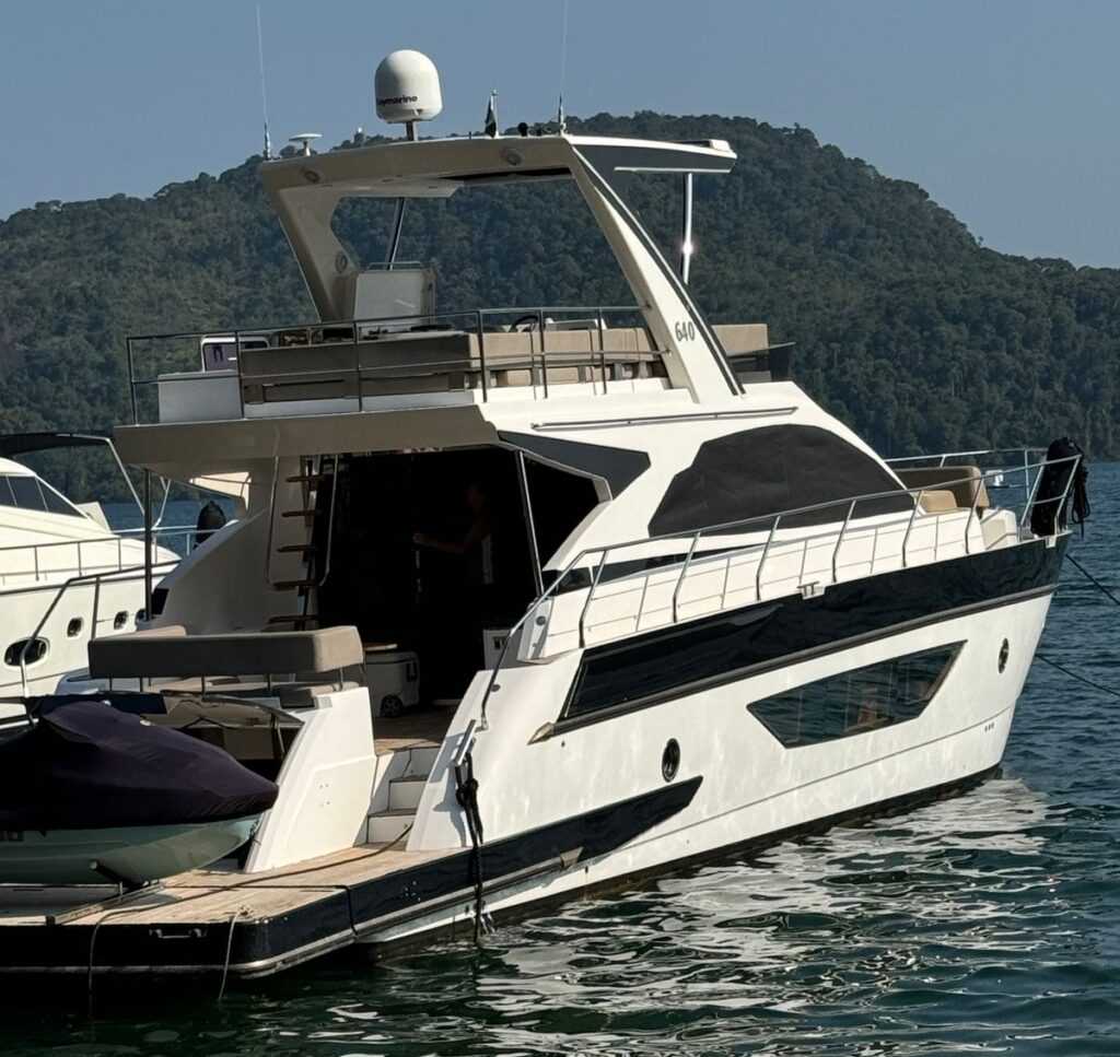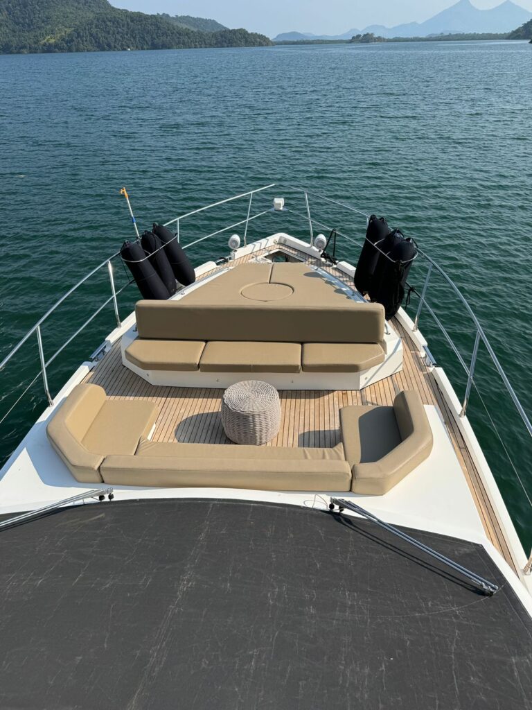 Possui flybridge completo com área gourmet, solário, espaço para convivência e posto de comando auxiliar. O cockpit é integrado à ampla sala e cozinha, oferecendo conforto e sofisticação. Na parte interna, conta com 4 suítes, além de cabine para tripulação, garantindo privacidade e conforto para todos a bordo.