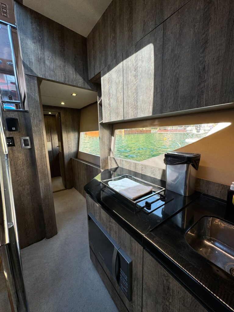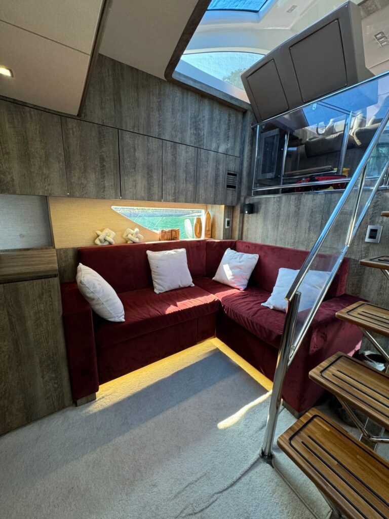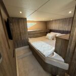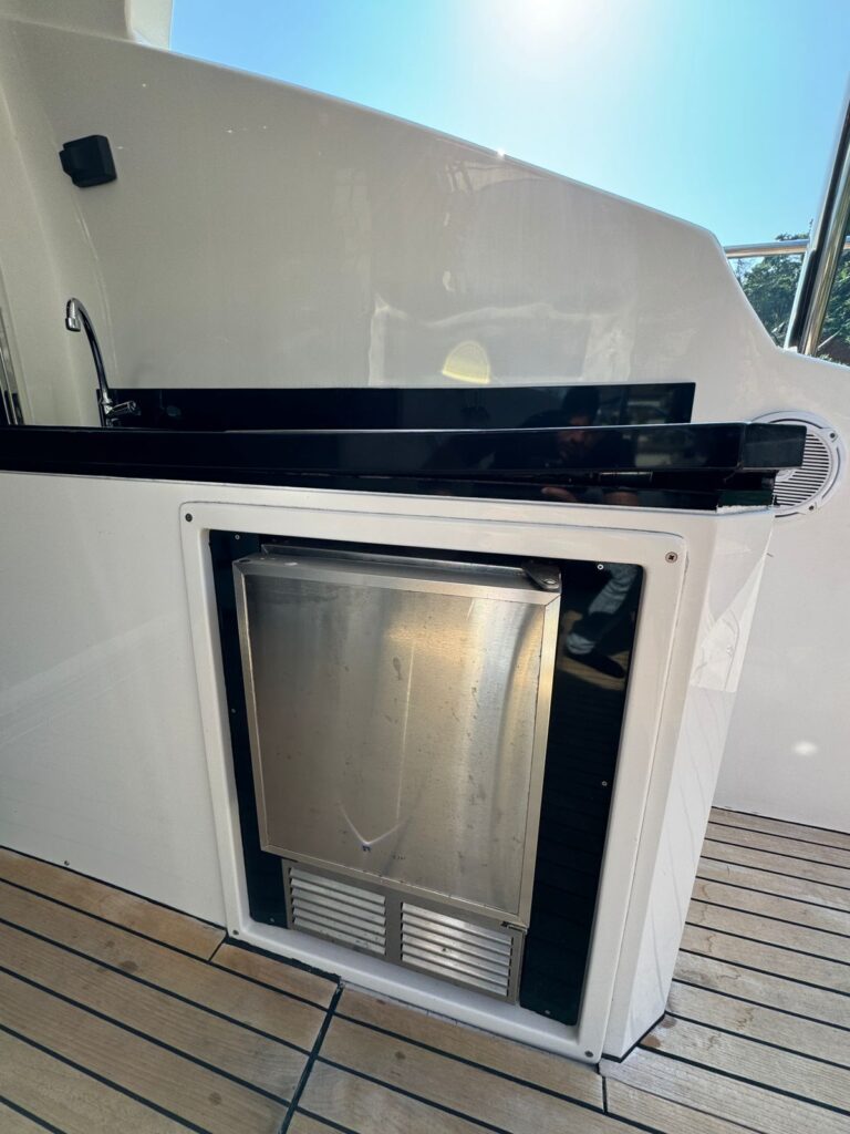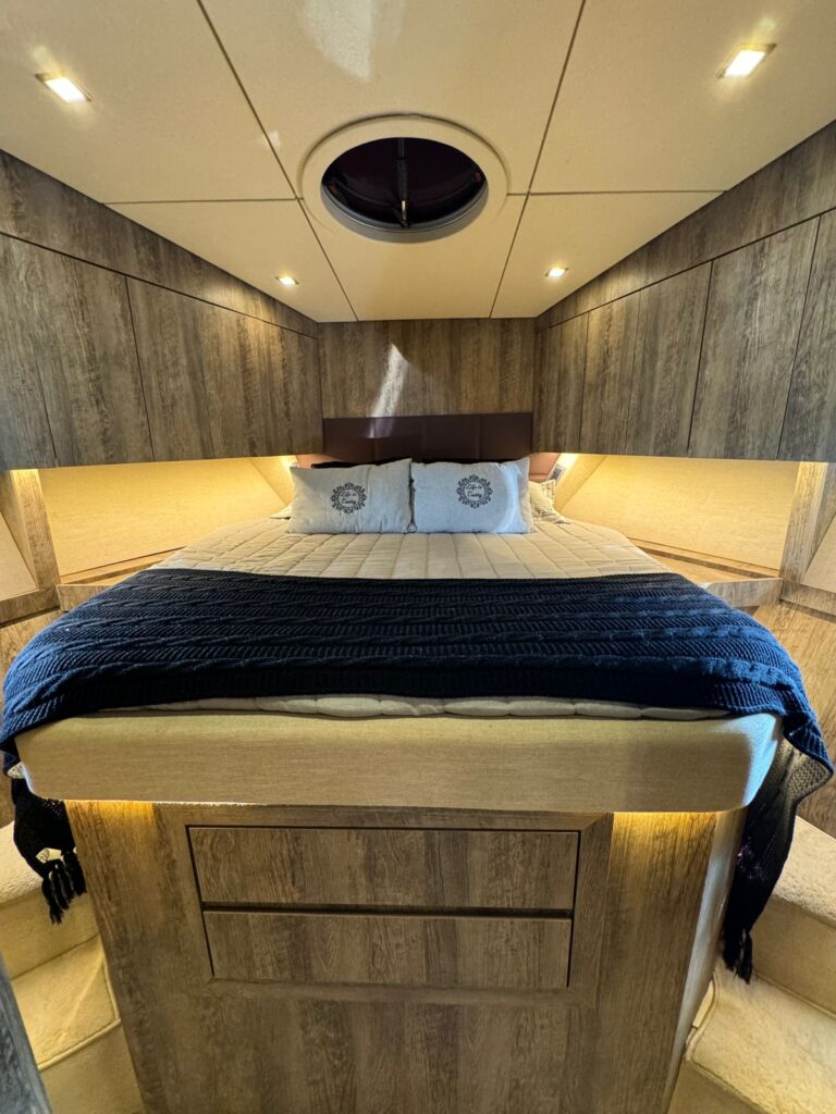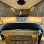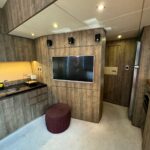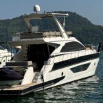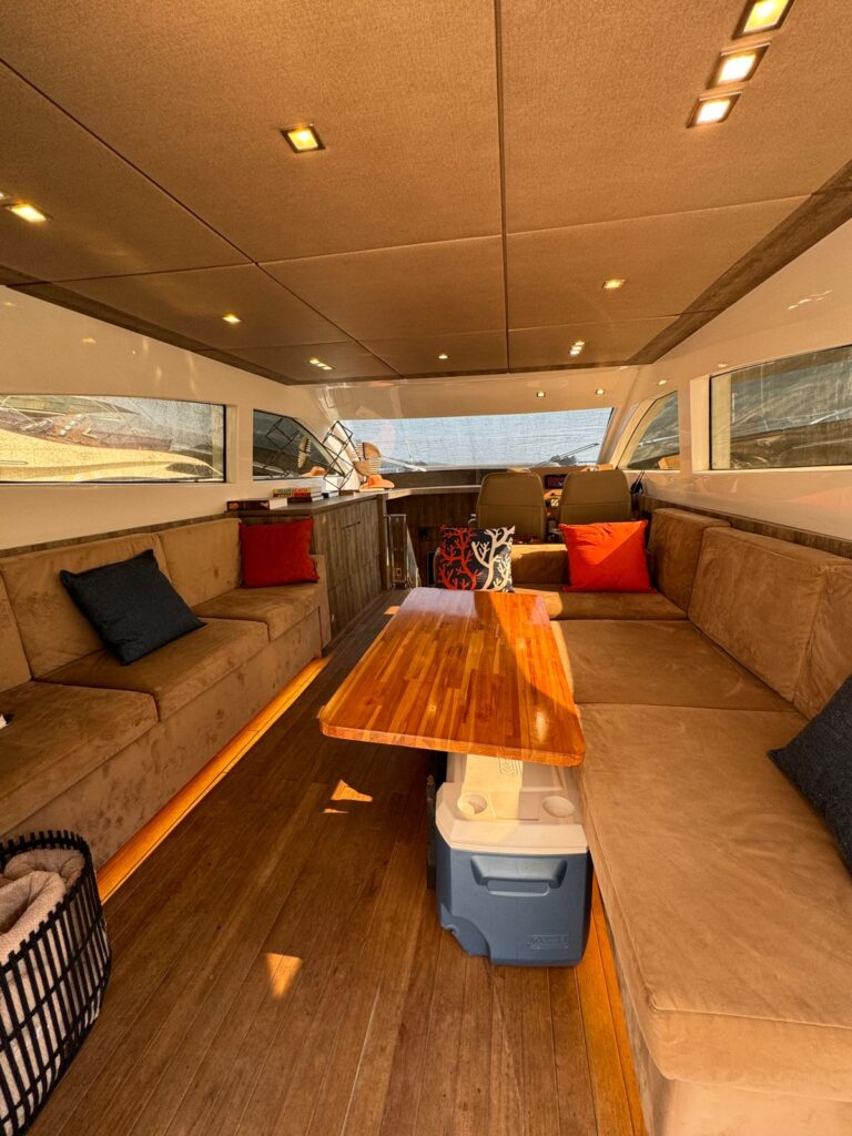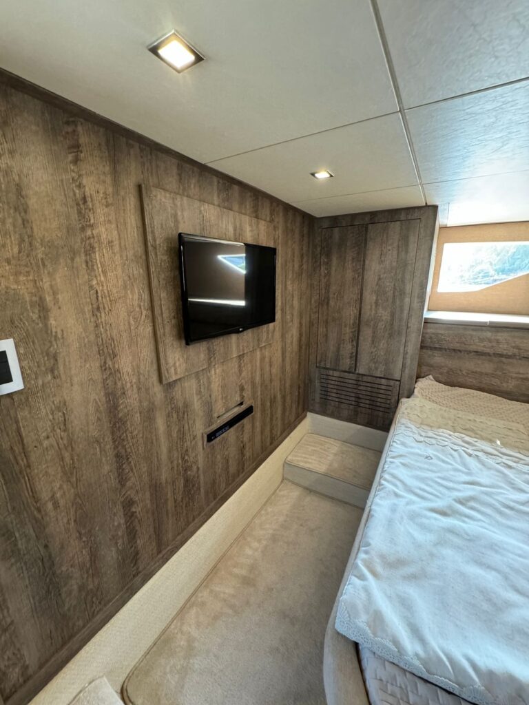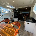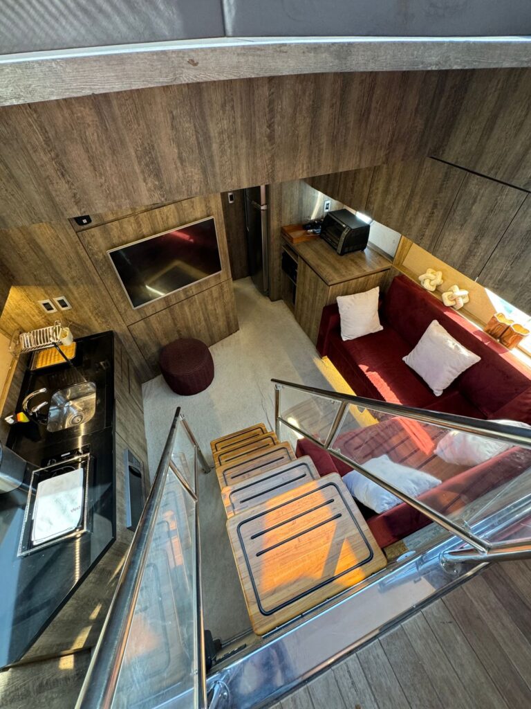 Possui flybridge completo com área gourmet, solário, espaço para convivência e posto de comando auxiliar. O cockpit é integrado à ampla sala e cozinha, oferecendo conforto e sofisticação. Na parte interna, conta com 4 suítes, além de cabine para tripulação, garantindo privacidade e conforto para todos a bordo.