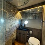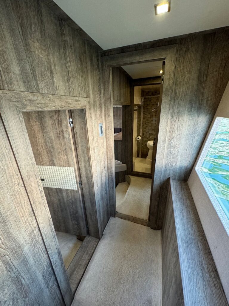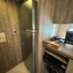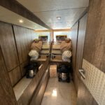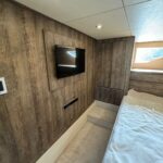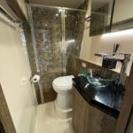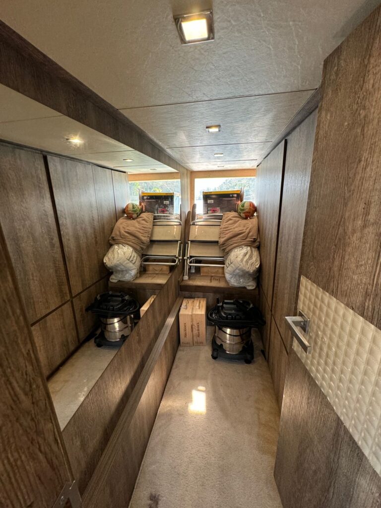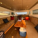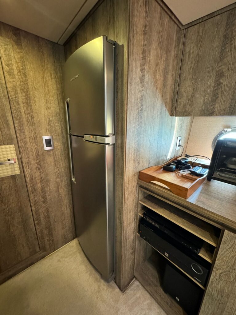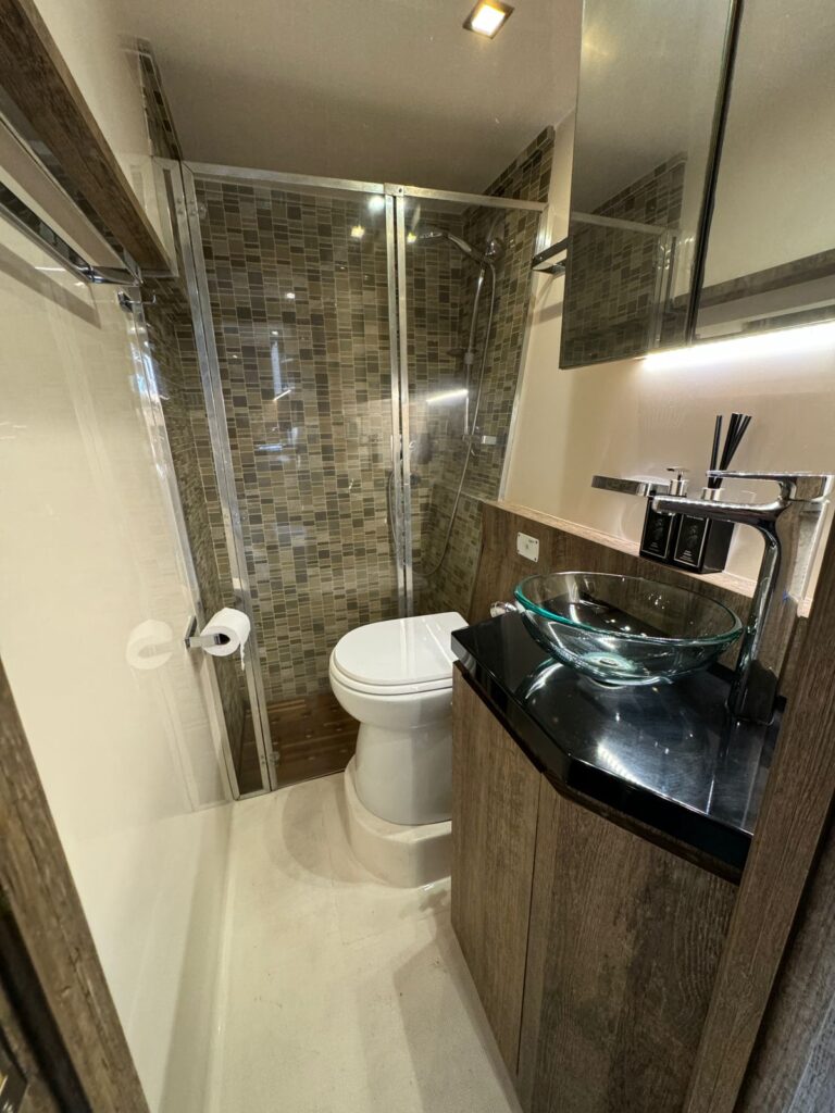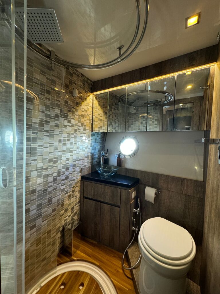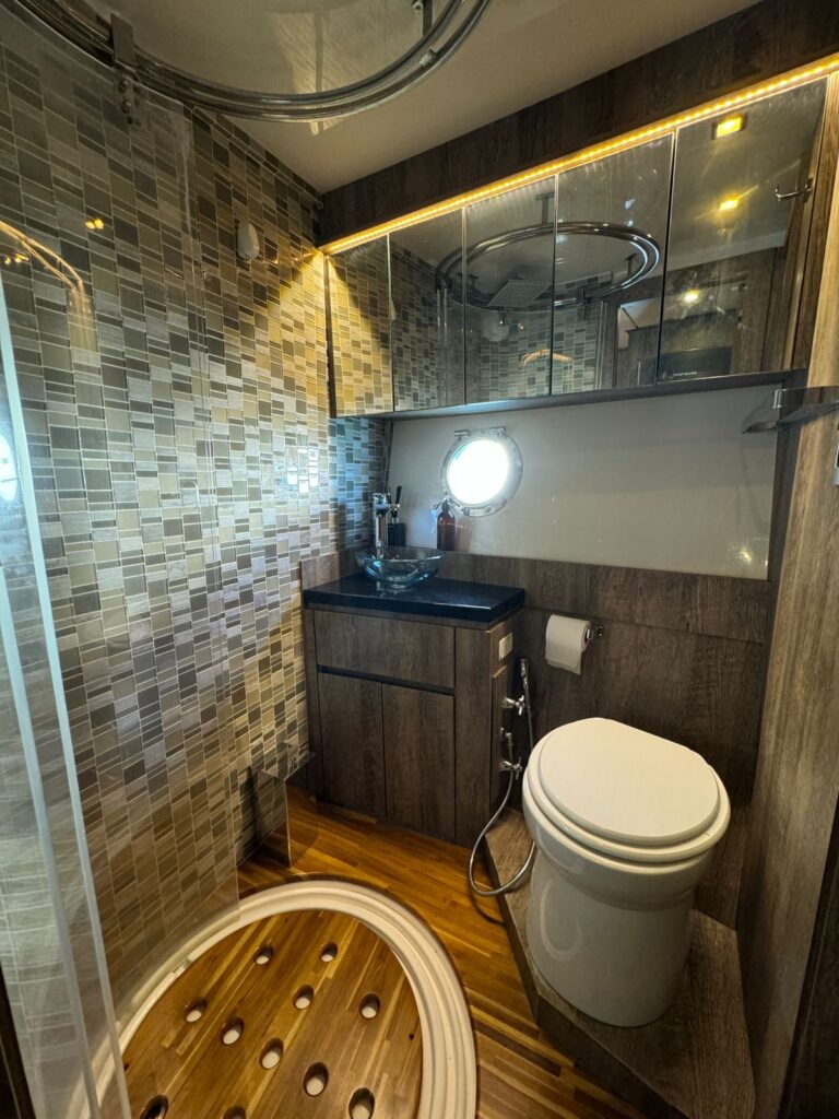 Possui flybridge completo com área gourmet, solário, espaço para convivência e posto de comando auxiliar. O cockpit é integrado à ampla sala e cozinha, oferecendo conforto e sofisticação. Na parte interna, conta com 4 suítes, além de cabine para tripulação, garantindo privacidade e conforto para todos a bordo.