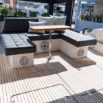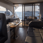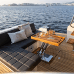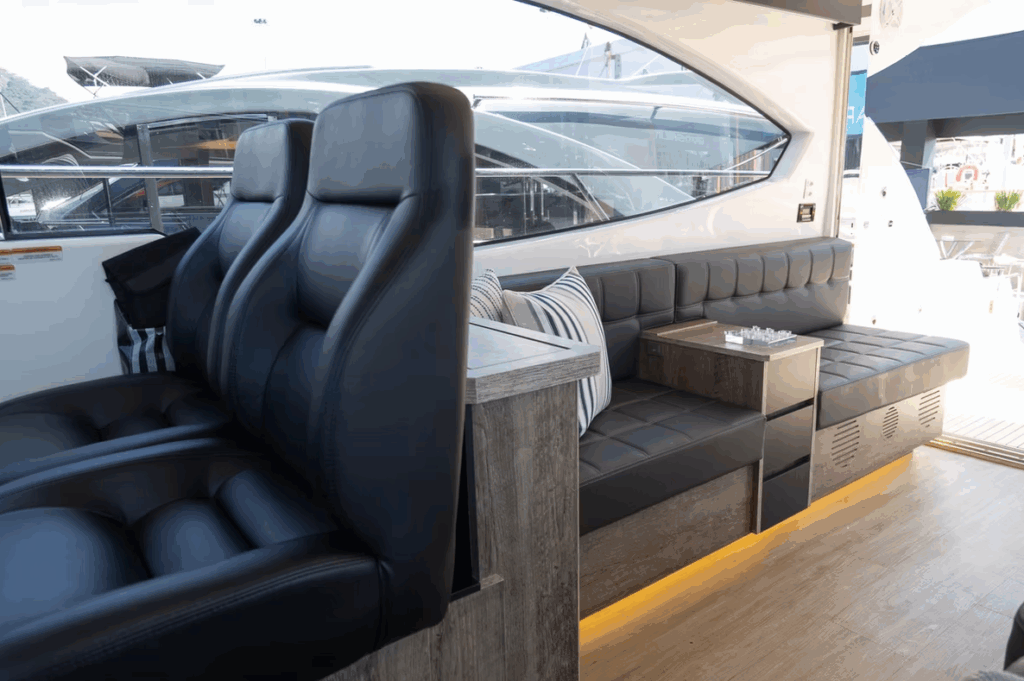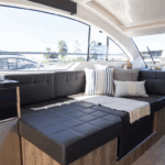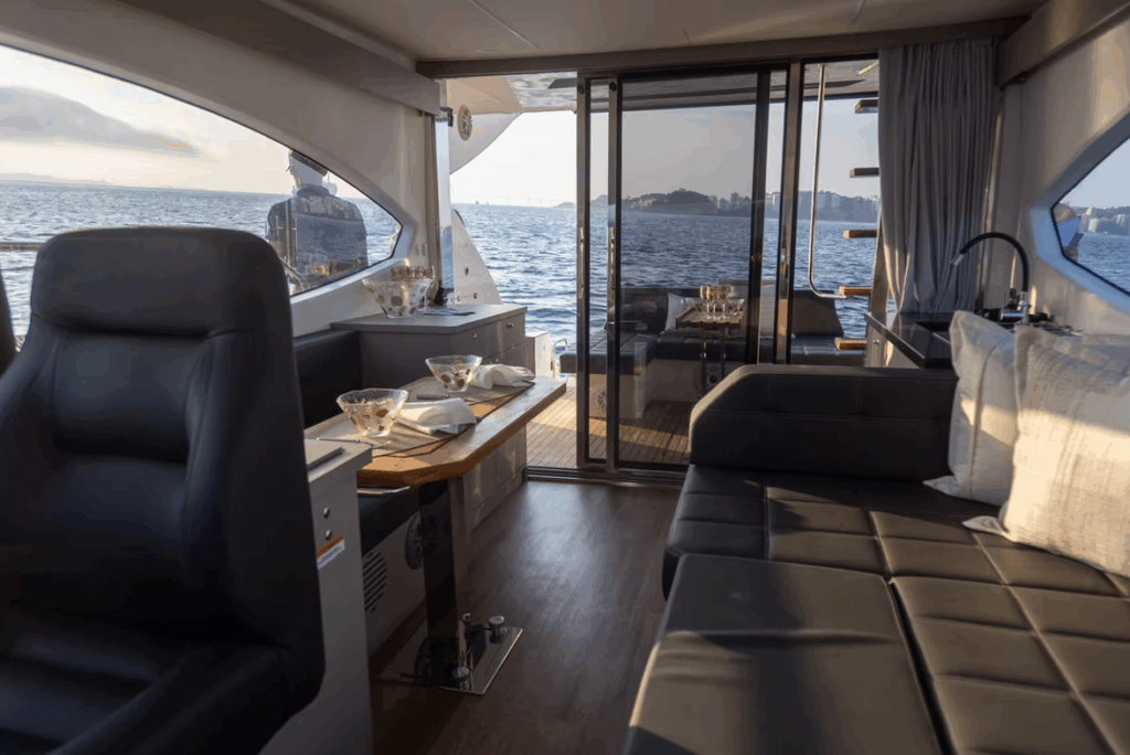 Na versão Fly, o flybridge conta com comandos duplicados, sofás, solário e uma vista privilegiada para o horizonte.