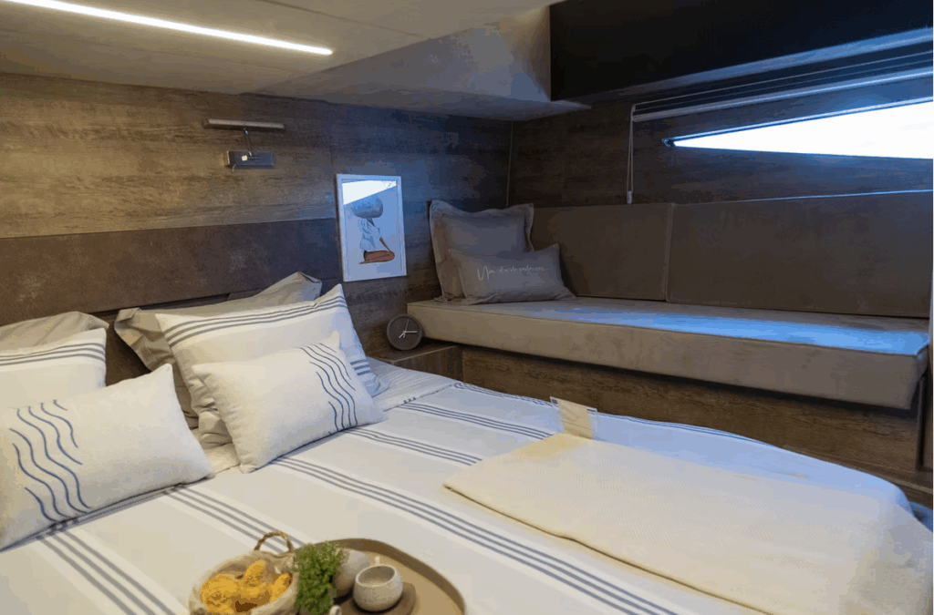 Cabine espaçosa, com acabamento de alto padrão, suíte master, camarotes e banheiros completos;
